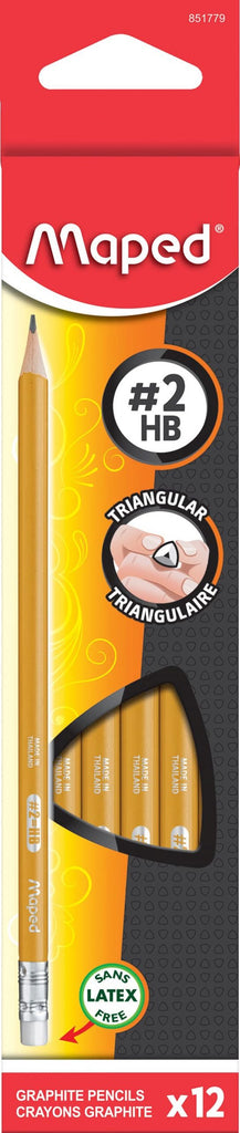Write more comfortably with this ergonomic, pre-sharpened #2 pencil! Unlike a standard hexagonal pencil, the triangular body of the Maped Essentials Yellow Graphite Pencils naturally index your fingers in the correct spots for a more comfortable hold, and they will not roll off of a desk or table! High quality #2 / HB graphite is break resistant and fully bonded to the wood casing so it sharpens and writes cleanly with no splinters or separated lead. Classic yellow pencil perfect for school with a Latex, PVC and Phthalate free eraser that cleanly removes graphite without smearing or tearing. Easy to sharpen in any standard pencil sharpener!