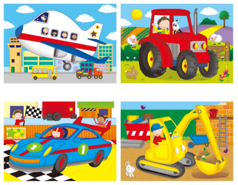 Set of 4 first puzzles featuring vehicles. Puzzles have different numbers of pieces to encourage the development of matching and sorting skills. 4 puzzles with 4, 6. 8 and 12 pieces.